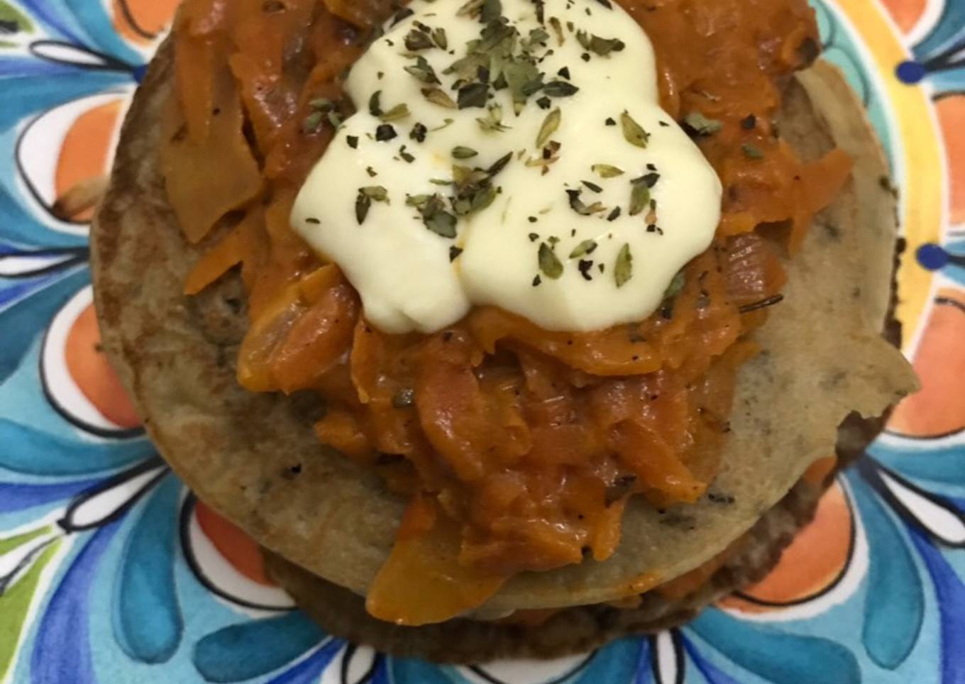 - Coloque los wafles uno encima de otro y en el medio puse el relleno caramelizado. Arriba puse un poco de queso cremoso y orégano.