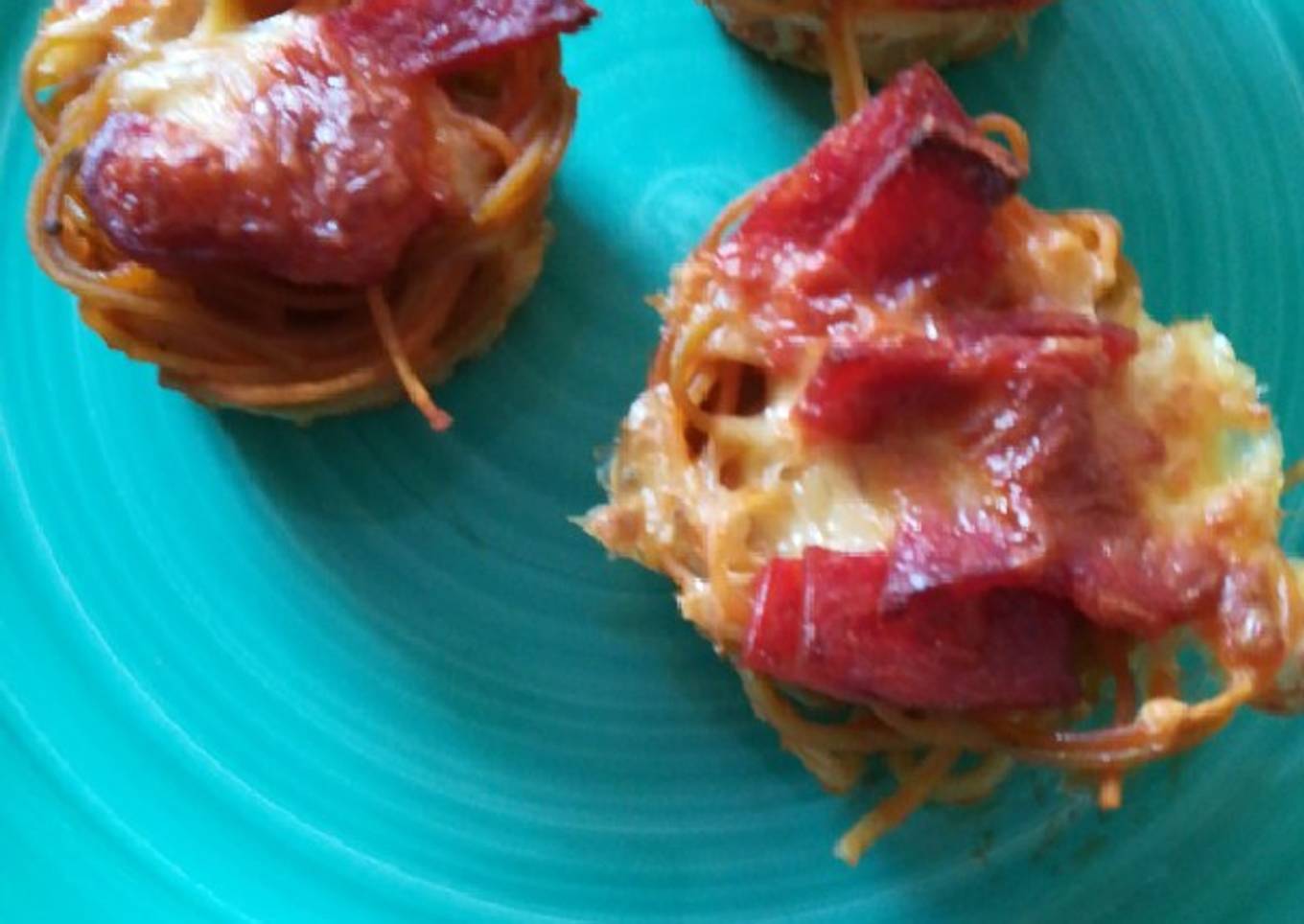 - Toma porciones del spaghetti y rellena cada molde, pon un poco de la salsa, encima un par de rebanadas de pepperoni, o jamón, o salchicha, o champiñones. Vierte otra cucharada de salsa y queso rallado.