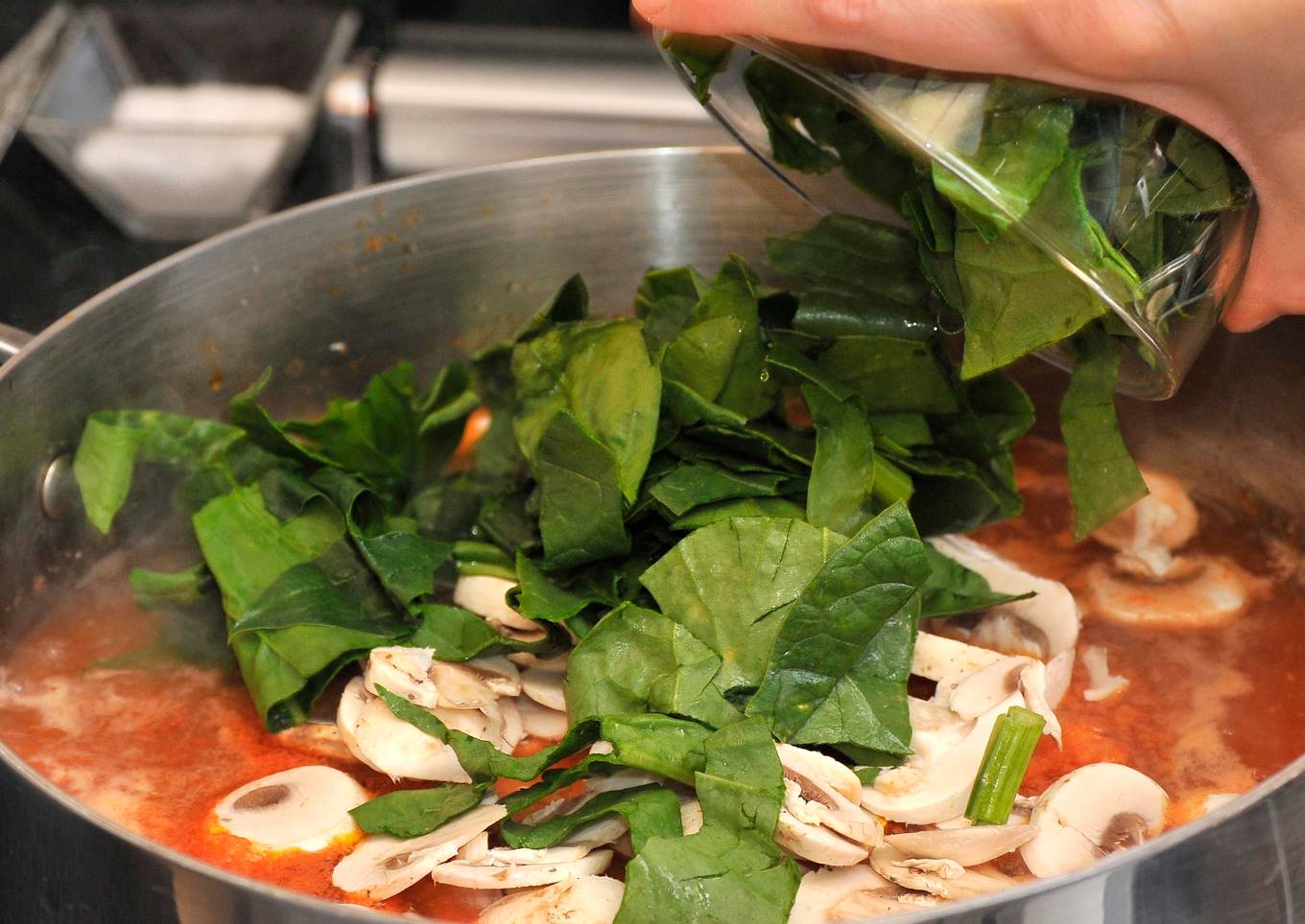 - Mientras tanto en una olla pones a freír cebolla picada con la espinaca y los champiñones,