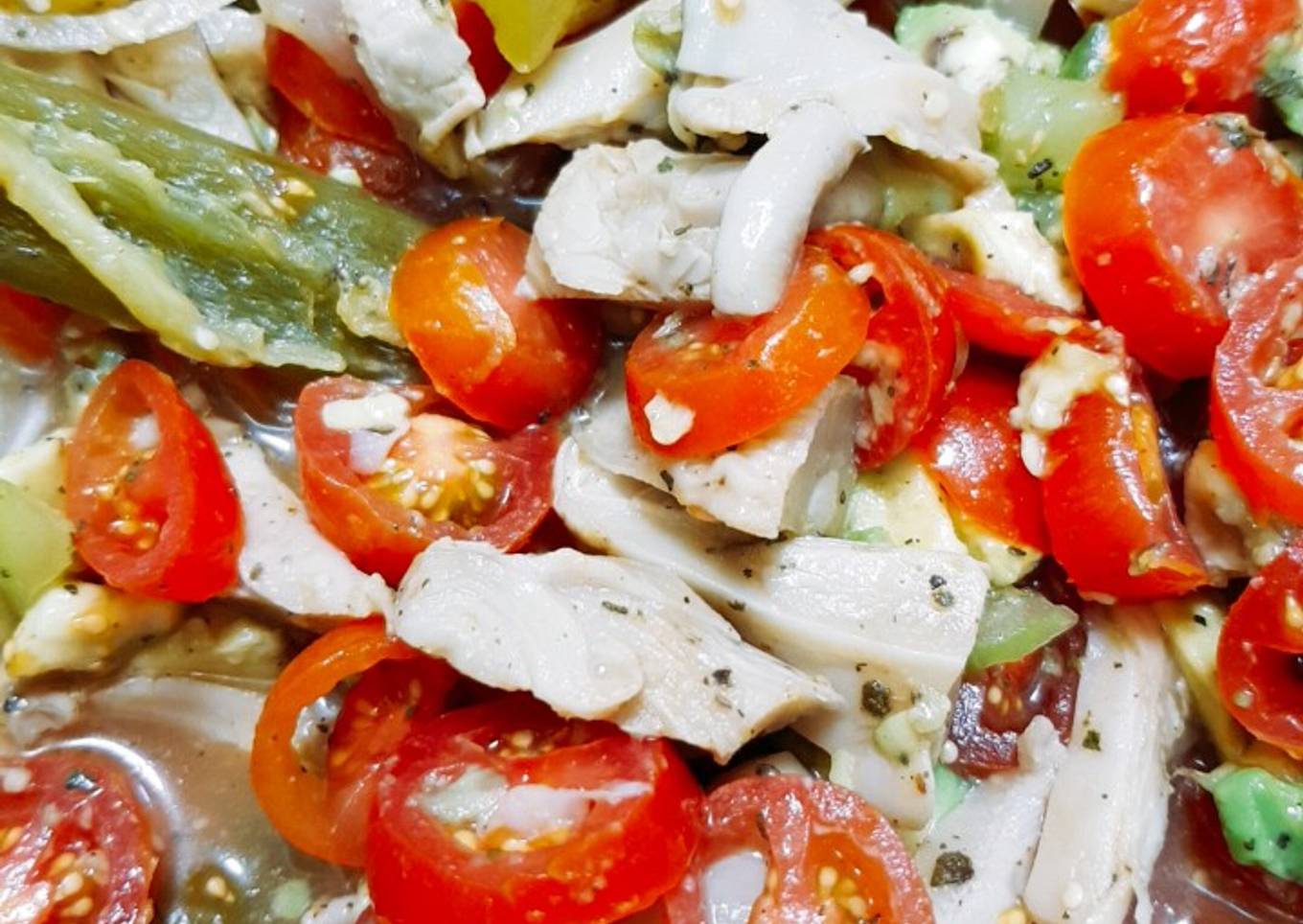 - Drenar la seta, colocar en un bol y agregar el jitomate, aguacate, rajas de chile, vinagre de chiles al gusto, pimienta, orégano seco, molido entre las palmas de mano, comprobar sazón y agregar sal si fuera necesario.