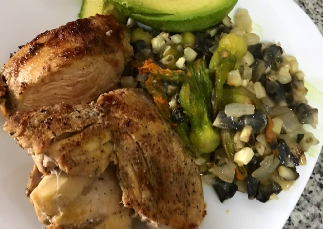 - Desgrana el huitlacoche y agrégalo, tapa y deja que se sazone por 10 minutos. Sírvelo con el pollo asado y adorna con aguacate