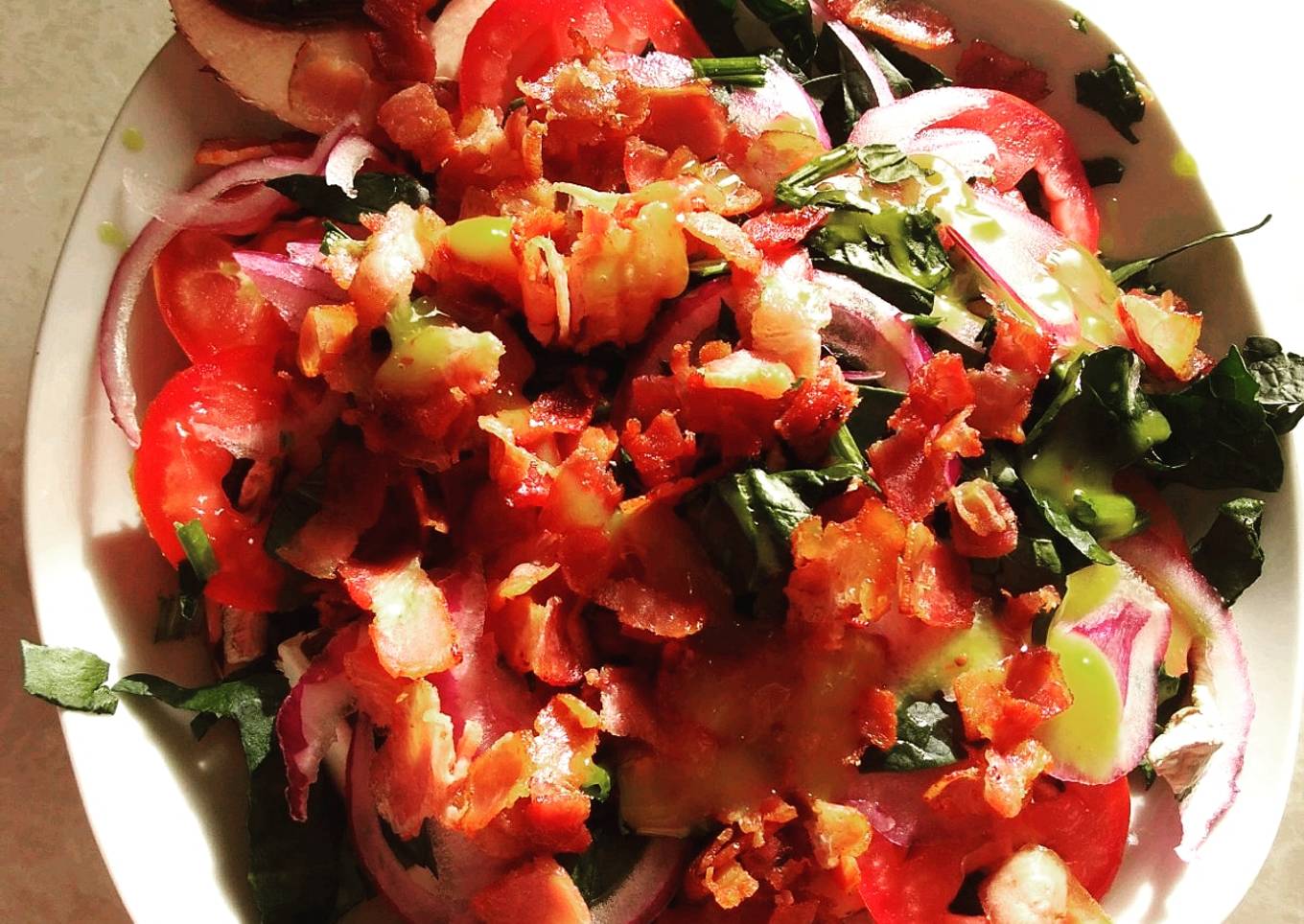 - 3 lonchas tocino gruesas, fritas, escurridas y trituradas