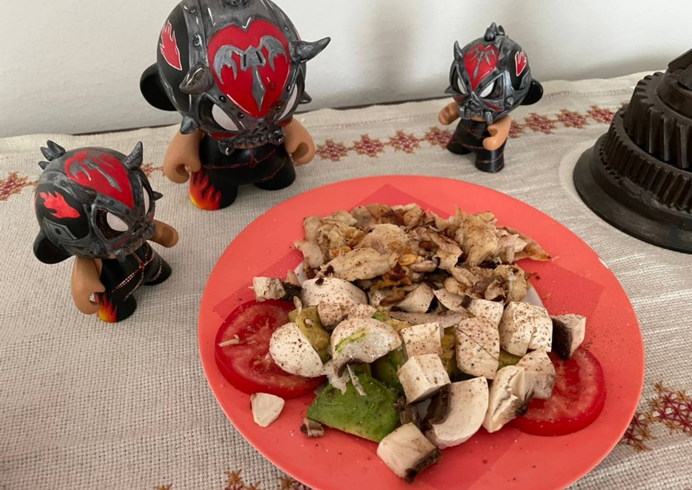 - O la parte ya picada con una ensalada de aguacate, champiñones, cebolla y jitomate. Usando de arderezo vinagre balsámico, limón, sal y pimienta. Listo pescado parejas!!!!!!