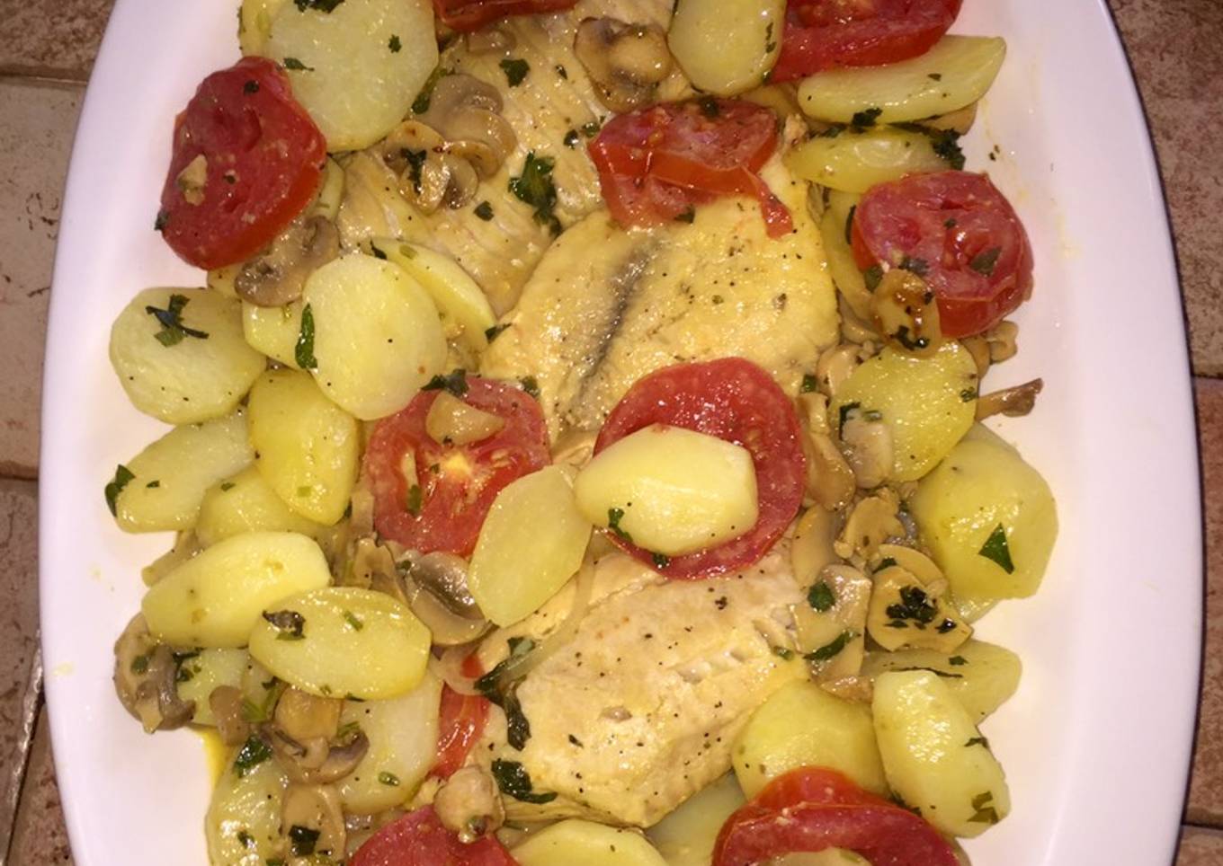 Tilapia con patatas y champiñones