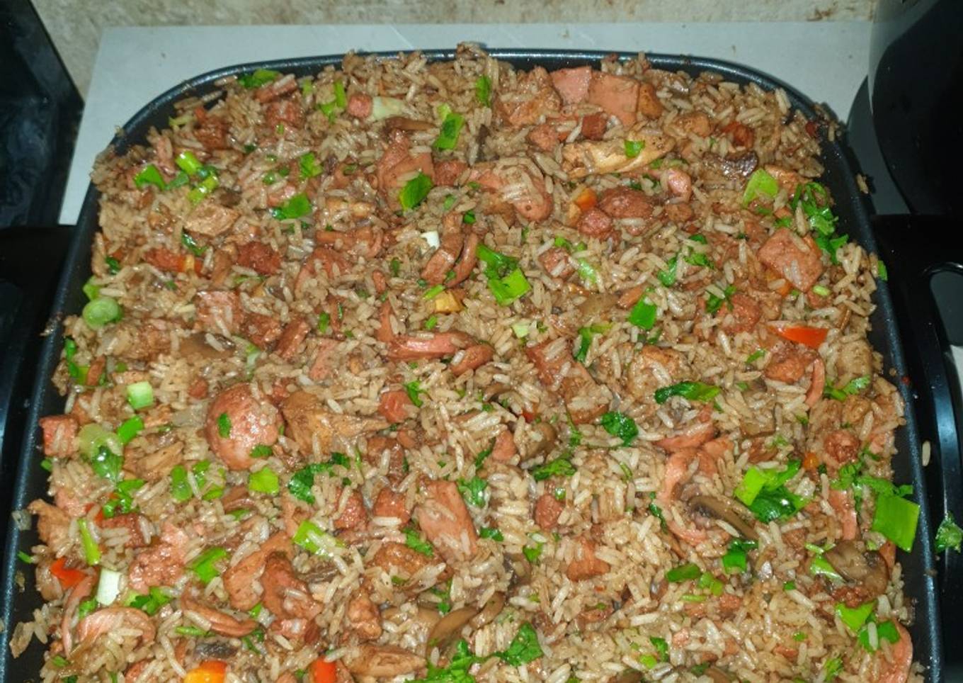 - Cocina a fuego medio durante 15 min aproximadamente con aceite de oliva y agrega un poquito de salsa china seguido de los embutidos