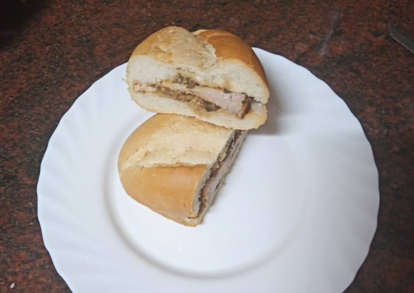 - Abrir el pan por la mitad. Untar con la salsa de champiñones, poner encima el lomo.