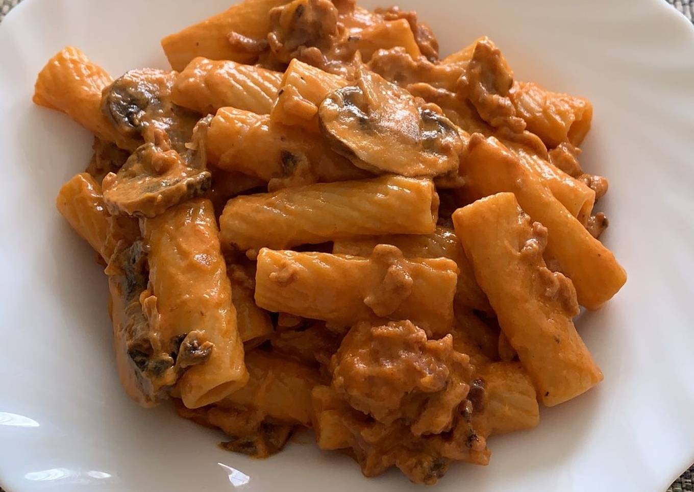 Pasta Tortiglioni con carne, champiñones y vermut rojo