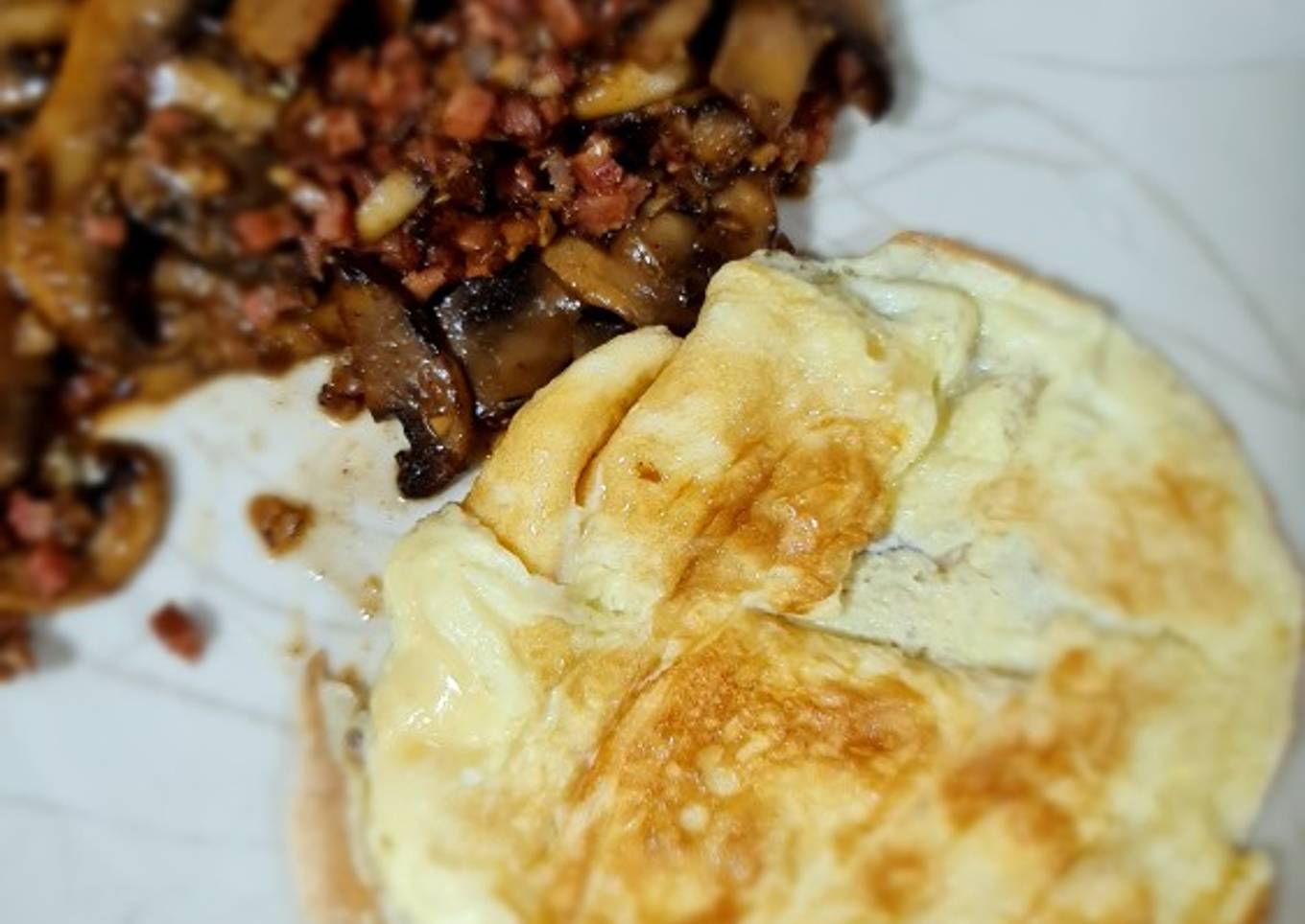 - Una vez que se está dorando echamos los champiñones y doramos y a continuación echamos el vino la pimienta y un poco de pimentón dejamos y dejamos hacer mientras hacemos la tortilla liada y la pasamos a un plato y ya los champiñones hechos también los emplatamos y listo (no hecho sal porque es suficiente con lo que suelta el jamón)