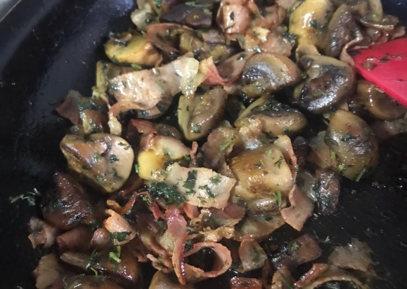 - Agregar la tocineta cortada en trozos y dejar sofreír. Cuando haya dorado la tocineta agregar el perejil finamente picado. Mezclar y listo, servir caliente.