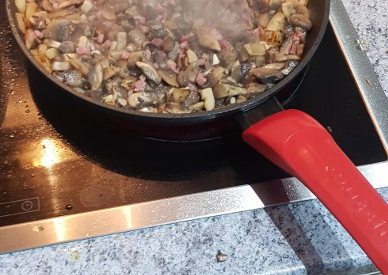 - Una vez sofrita la cebolla añadimos de nuevo los champiñones y el jamón crudo. Los dejamos que cojan saborcito y a disfrutar!