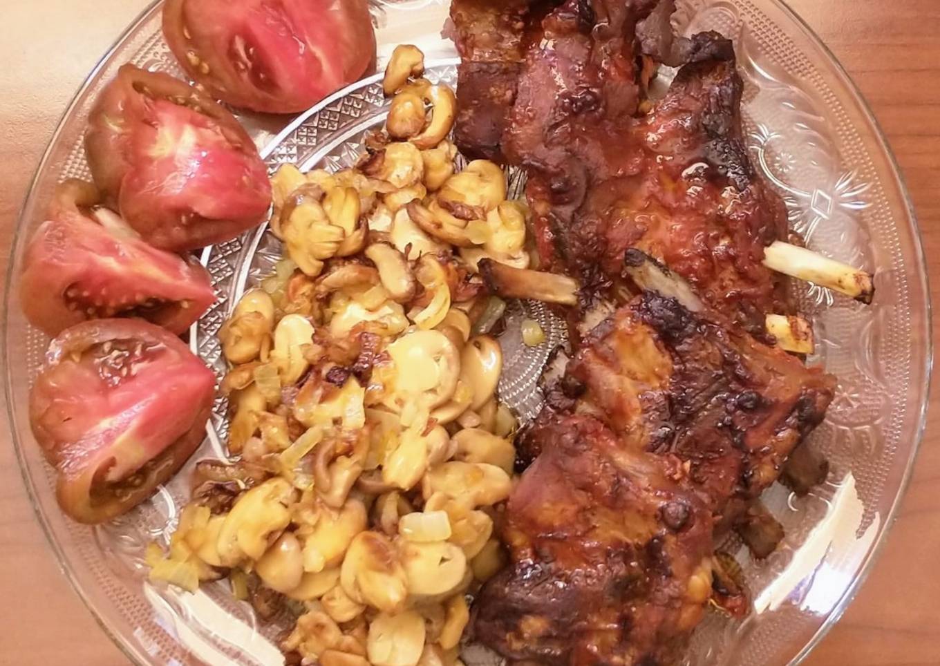 Costillas marinadas en salsa de tomate, ketchup y mostaza con salteado de champiñones