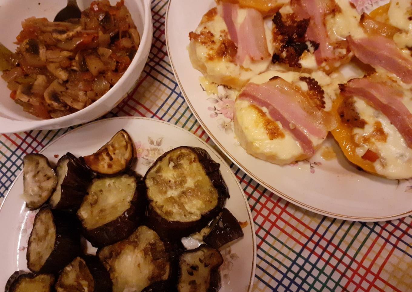 - Listo. Retirar del horno los vegetales, servir los calabacines con panceta crocante y queso derretido con las berenjenas doradas y la salsa de champiñones por encima de estas últimas.