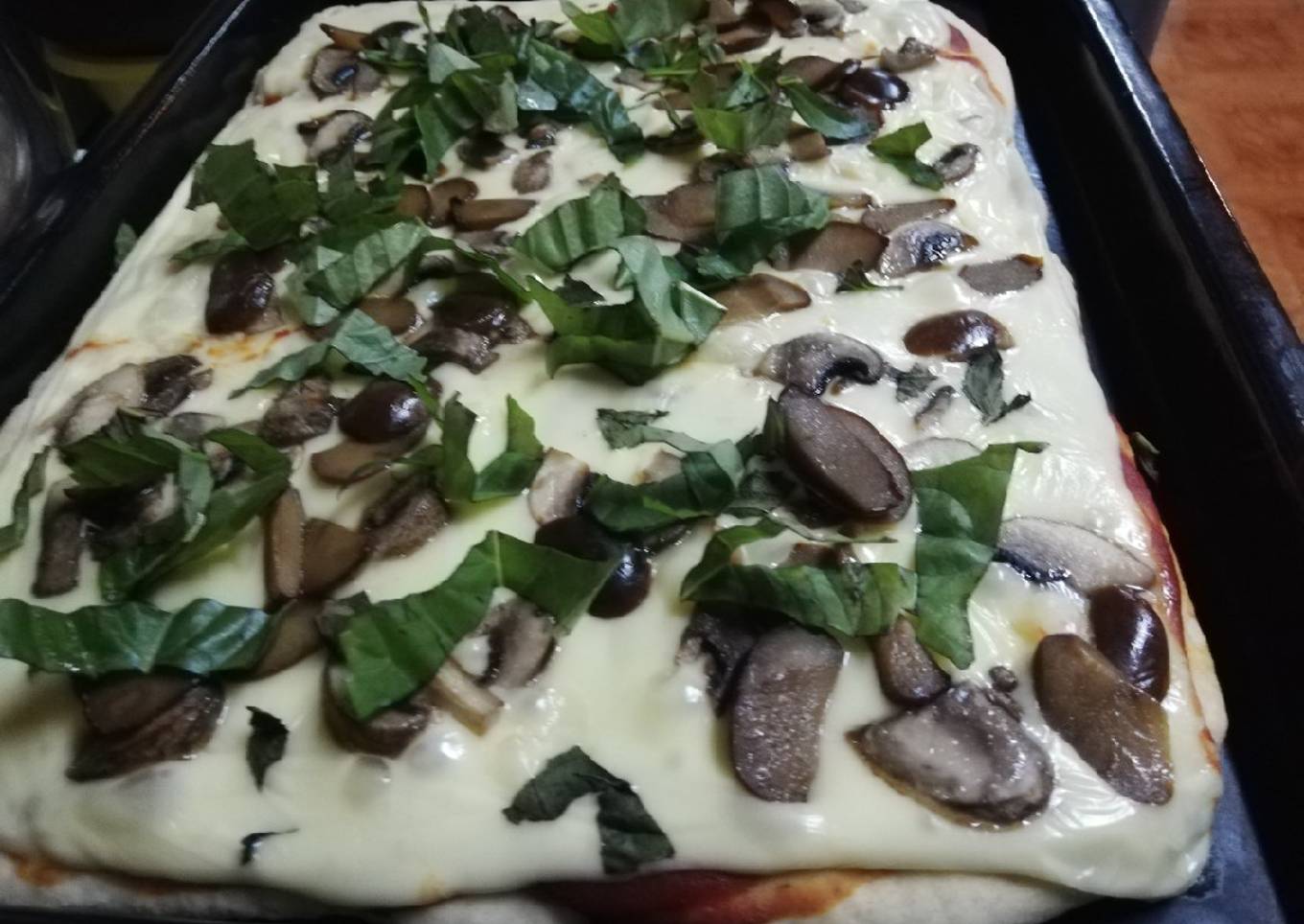 Steps to make to make Pizza de champiñón, aceitunas y albahaca🍕